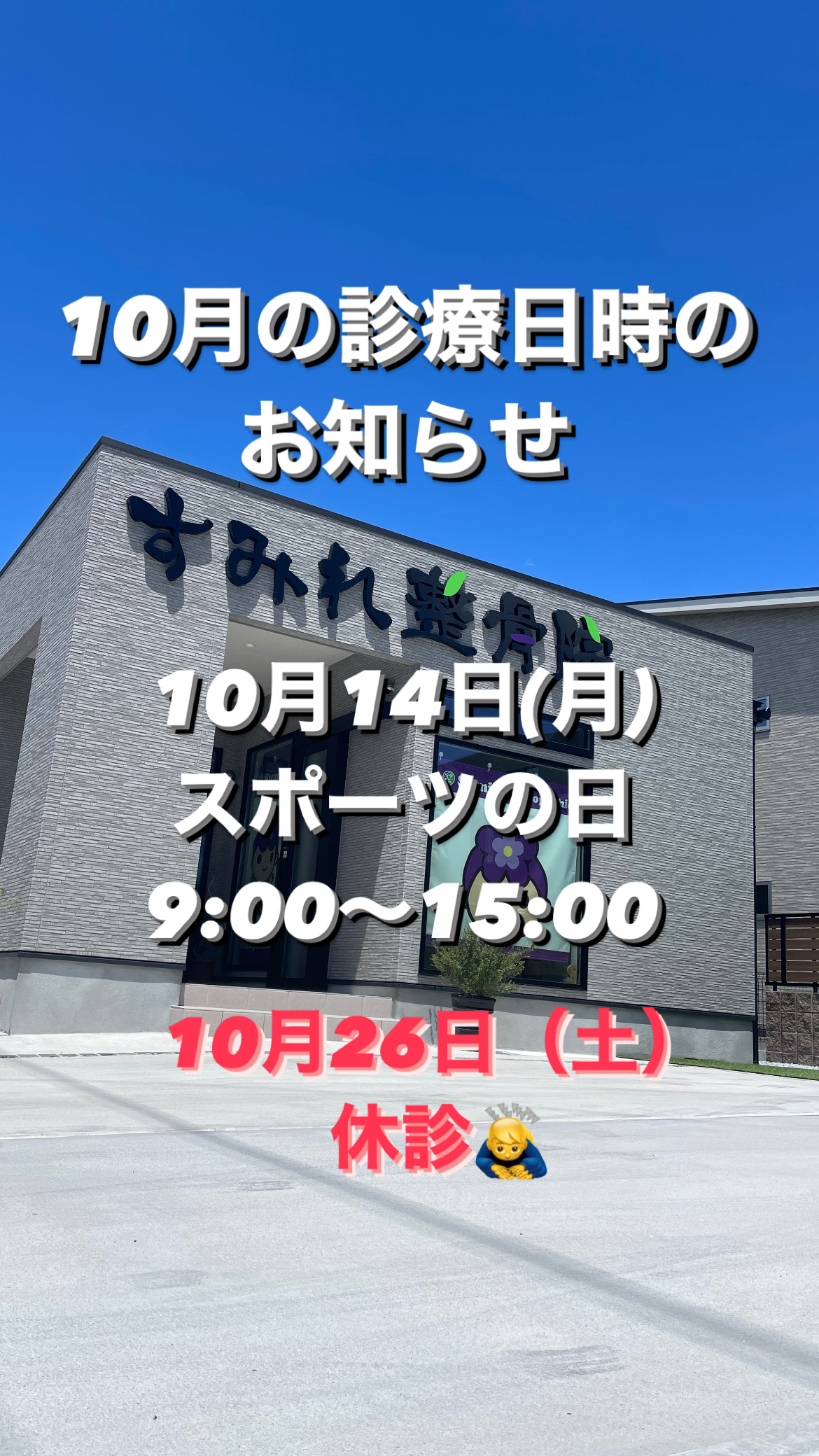 10月14日月曜日 スポーツの日 9:00〜15:00 祝日診療を行います 完全予約制です ご予約の上来院下さい