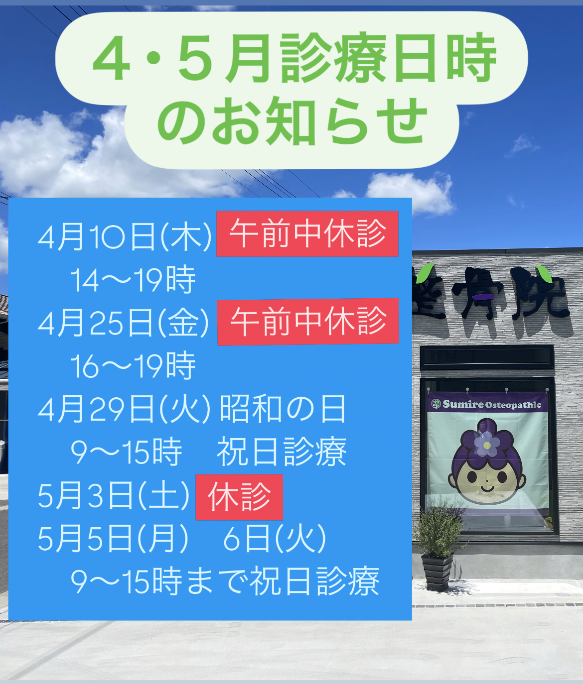 4月の診療日時のお知らせ